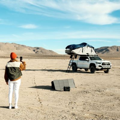 - Vollständige Ladezeit: 1,6 Stunden (AC), 6,5 Stunden (12-V-Kfz-Ladegerät), 3–6 Stunden (bei Verwendung von zwei parallel geschalteten 110-W-Solarpanelen in voller Sonne), 4,8–9,6 Stunden (bei Verwendung von einem 160-W-Solarpanel in voller Sonne)